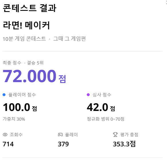 최종 72점이라는 점수를 기록하여 심사위원 점수 합산 5위를 기록했습니다.